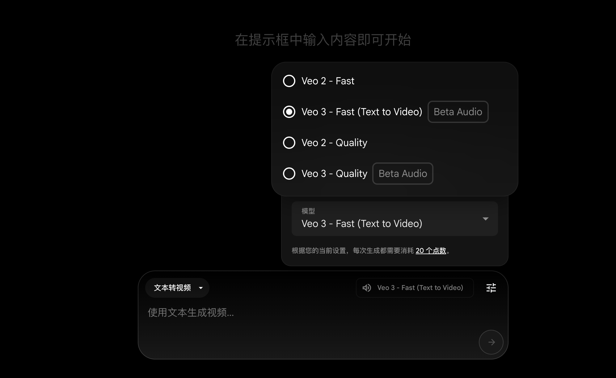 目前提供 Veo3 - Fast 和 Veo3 - Quality 两个版本,而 Fast 模型每次生成需要扣除 20 个点数,相当于一个月 50 次。