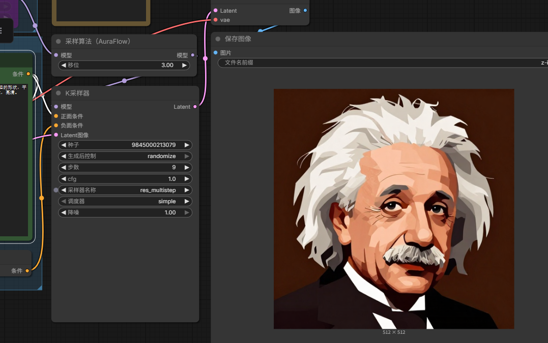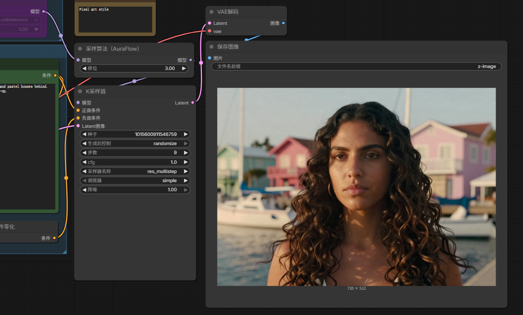 然后就可以进行文生图了,直接用上面的英文提示词先简单试试,这个模型是支持中英文的,并且生成速度还挺快的