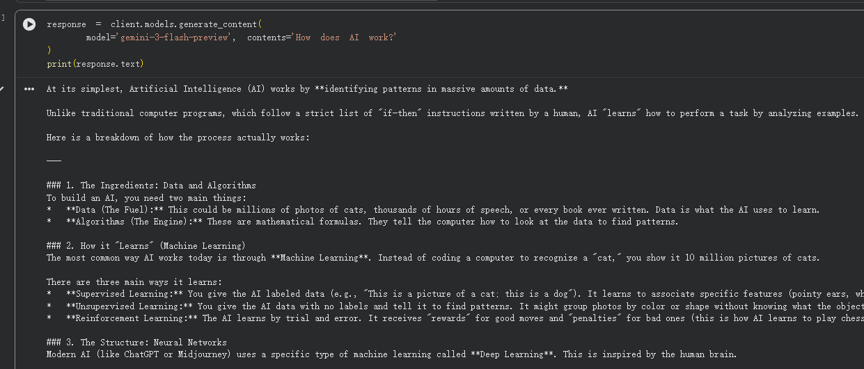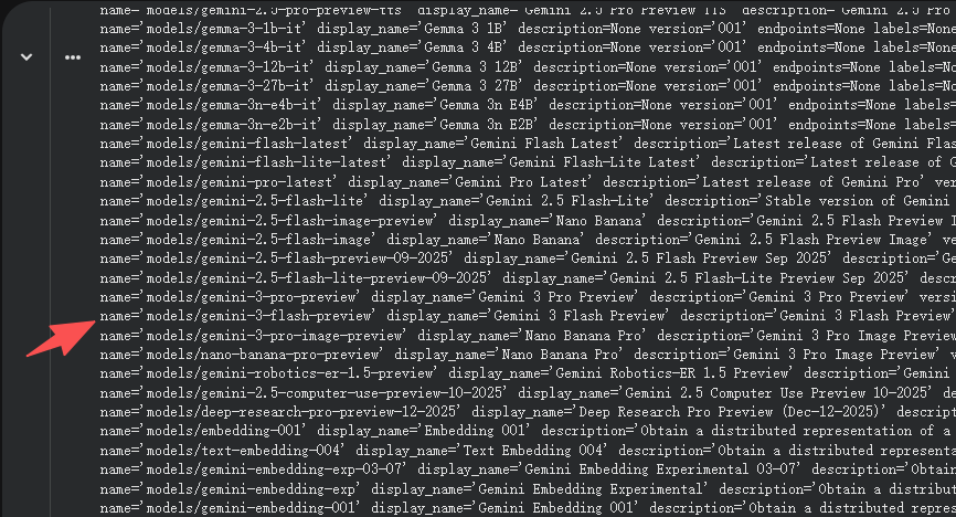 不过我比较关心的是 API 能不能免费试用,通过 colab 查询了一下我的 KEY (普号)能不能使用最新的 Gemini 3 Flash 模型