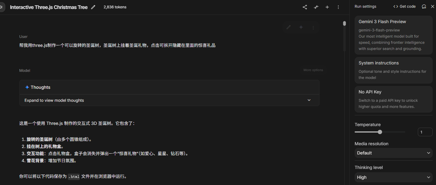 直接在 AI Studio 上面使用 Gemini 3 Flash 模型,让它用 three.js 制作一个可以旋转的圣诞树
