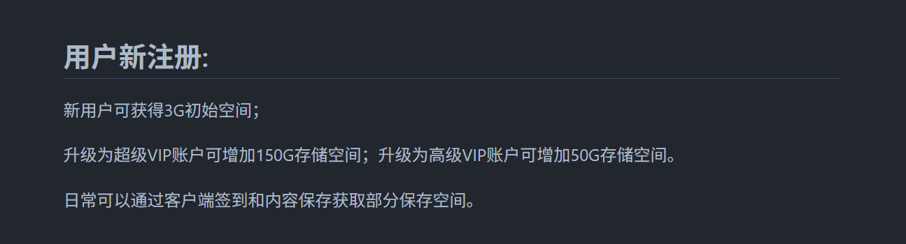 新用户只有 3G 空间,但是可以通过 签到 每天累计获取几M的空间,我比较懒,目前是 6G 左右的空间。