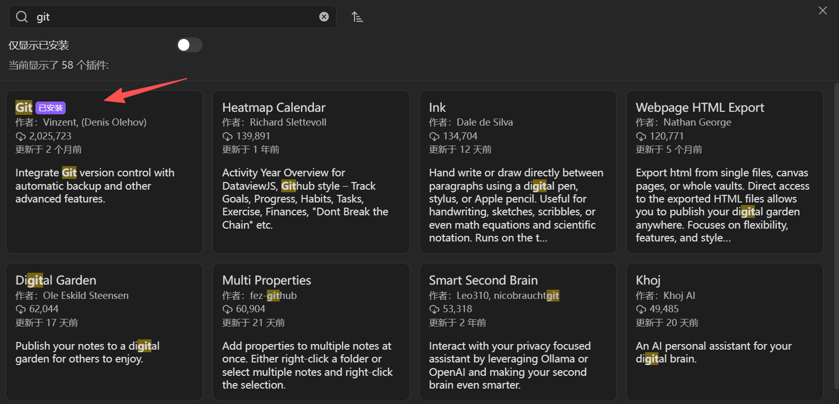 如下图所示,在插件市场中,搜索 git,并安装红色箭头所示的插件。