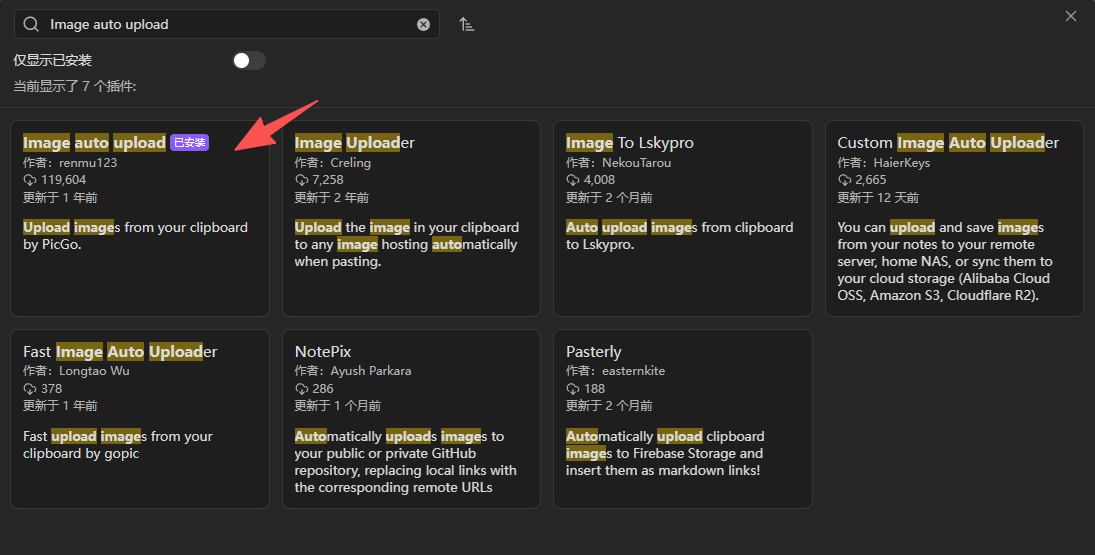 如下图所示,在插件市场中,搜索 Image auto upload,并安装红色箭头所示的插件。