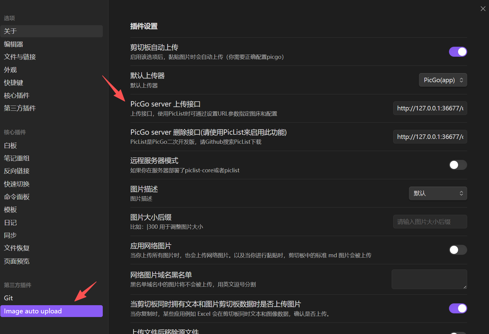 也是需要通过插件的方式进行云端的保存,这里主要介绍如何通过 Image auto upload 插件和 PicGo 软件进行图片保存。