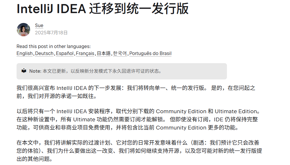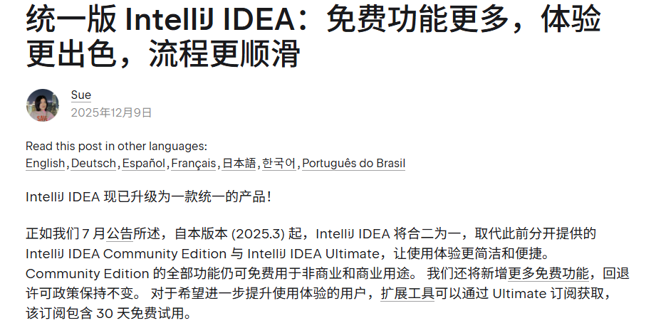早在 2025 年 7 月的时候,Jetbrains 官方就放出了一个重磅的消息,IntelliJ IDEA Community Edition 与 IntelliJ IDEA Ultimate 将合二为一,意思就是 不再区分 Community(社区版)和 Ultimate(旗舰版)两个独立发行包,而是统一为一个“Unified Edition”。