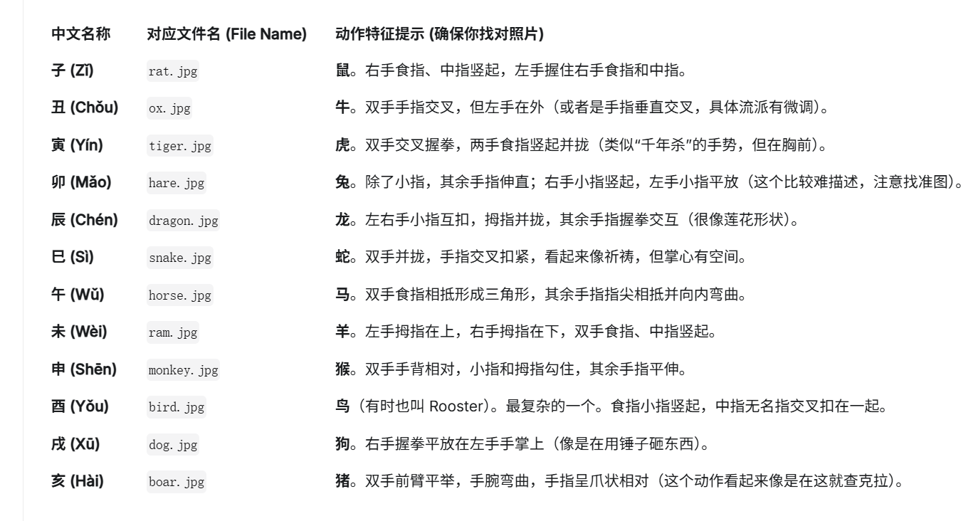 在《火影忍者》设定中,施放忍术需要通过特定的手势组合来引导查克拉。这些手势原型源自中国的“十二地支”。本质上,这是一个静态手势序列匹配的问题。系统需要按顺序识别出用户是否做出了正确的手势。