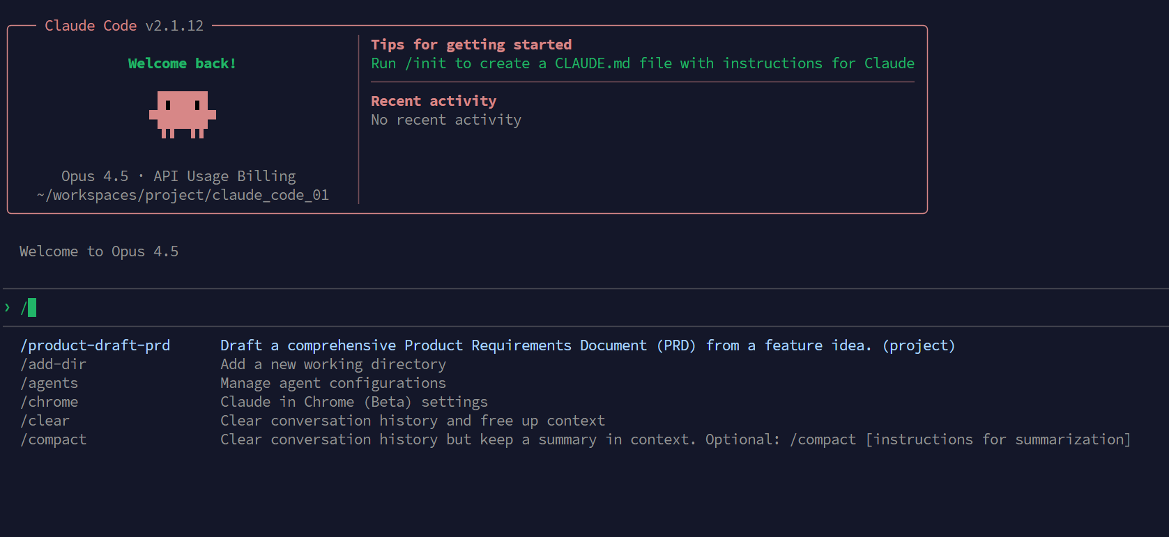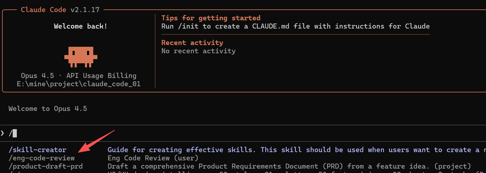 启动 Claude Code 工具,输入 / 就能够看到刚才创建的 product-draft-prd 技能