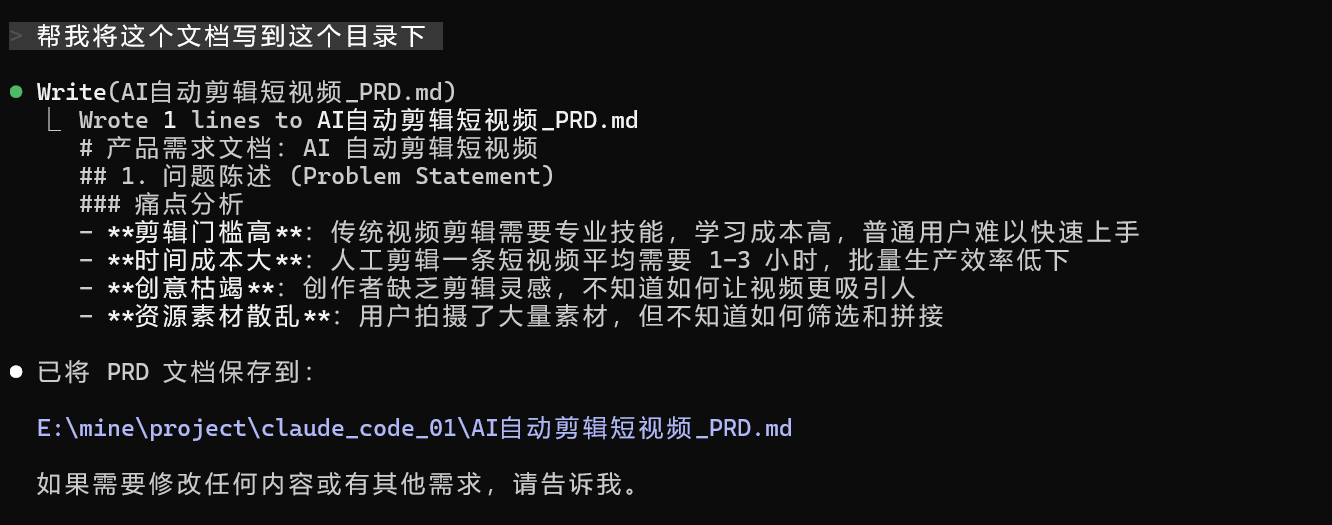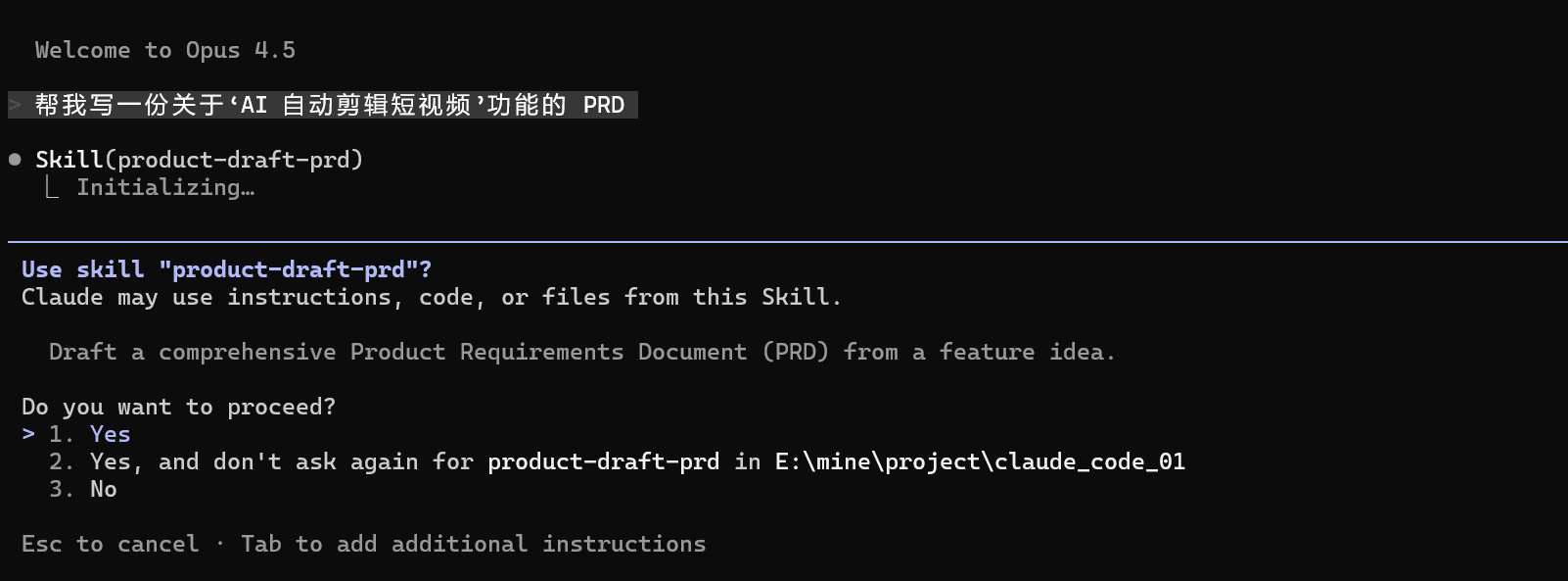 然后我们尝试一下在 Claude Code 中来使用这份 Skill,然后将它命名为 product-draft-prd,并保存在项目中 .claude/skills/product-draft-prd/SKILL.md,这样就仅此项目能使用。