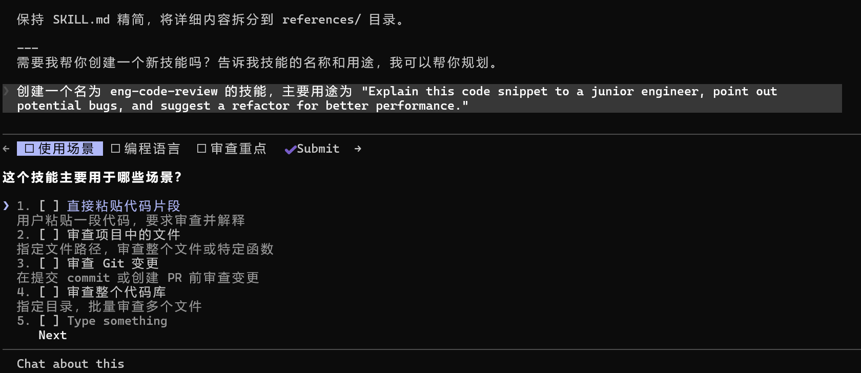 然后将技能名称和 Prompt 提示词发给它,它就会给我们分析这个需求,并且会提出一些问题,它这边会按照三个维度(使用场景、编程语言、审查重点),我们按照实际情况做出选择即可