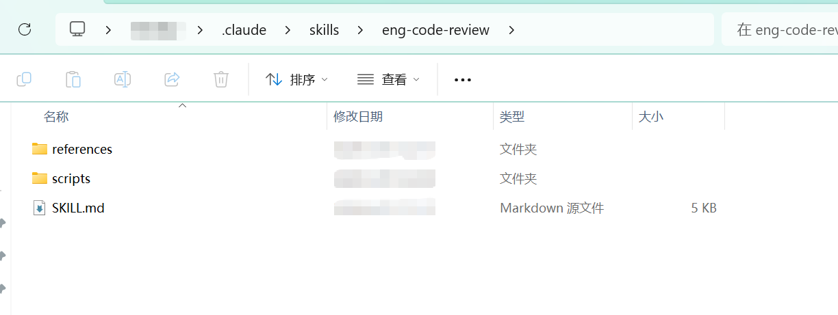 处理完以后,就能够在 .claude/skills/ 里面看到生成了一个新的 eng-code-review 目录,这个就是我们刚才创建的新 Skill