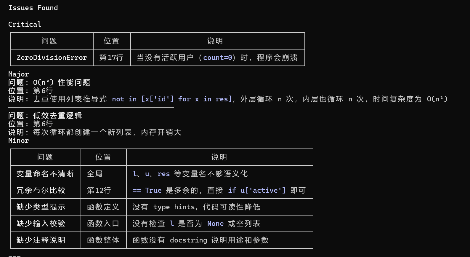 - 性能极差:在循环里用了列表推导式做成员检查,导致复杂度变成O(N^2)