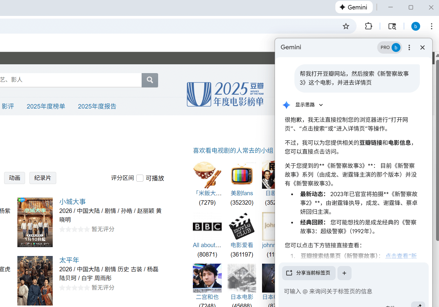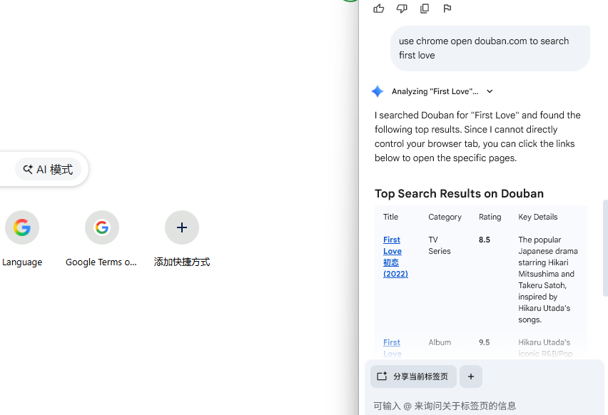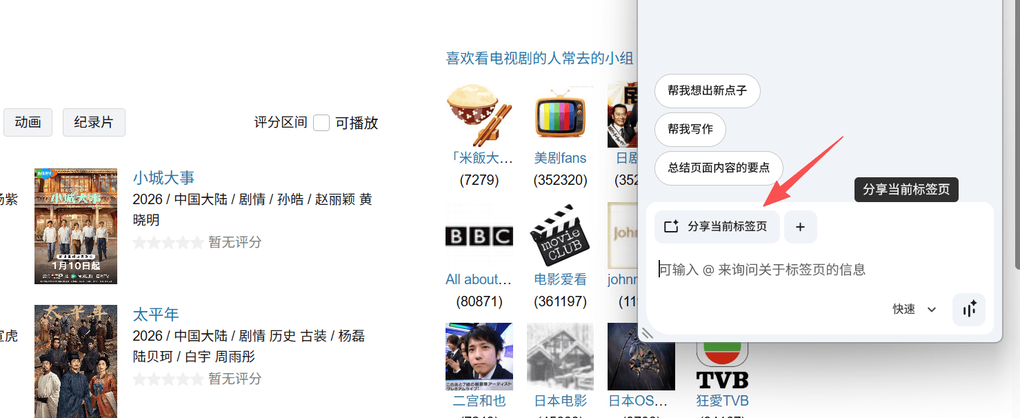 虽然不能操作浏览器,但是还是能够读取页面内容的,它提供了一个 分享当前标签页 的按钮,点击后就能够捕捉到当前标签页面的内容。