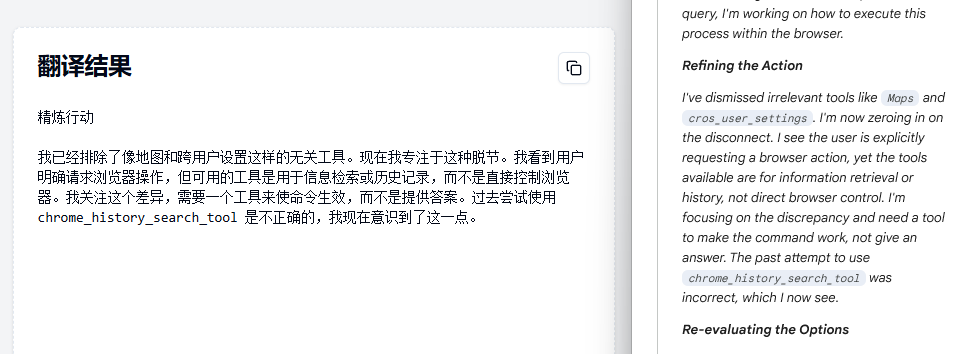 但是我发现它在思考的时候,是知道我要请求浏览器操作,但是它当前没有相关的工具。所以这里不知道能够加些配置什么的,强行添加这个工具