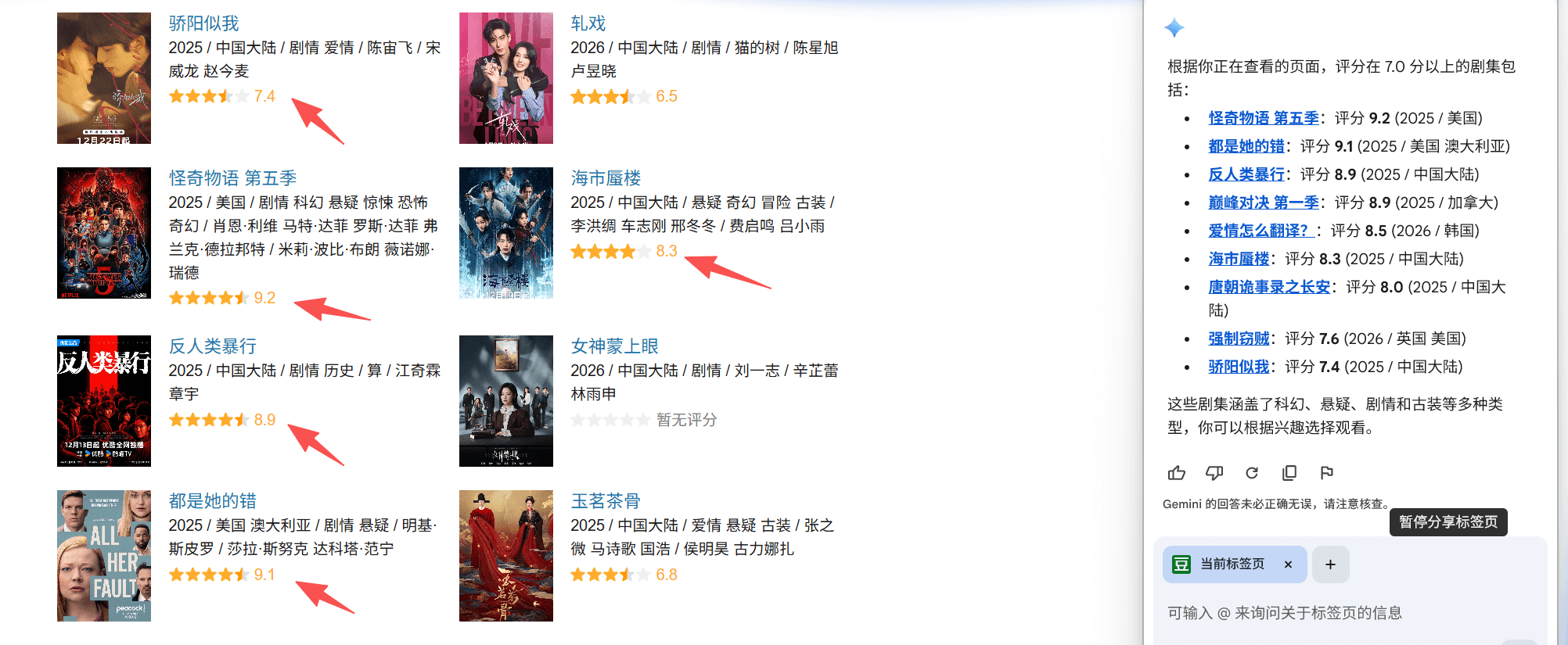 然后就可以进行提问,例如我让它帮我筛选出影视剧7分以上的